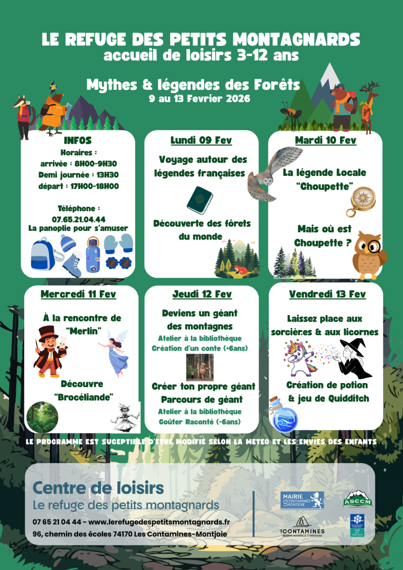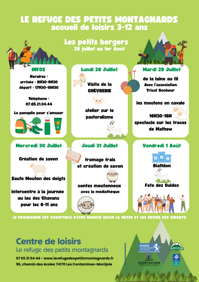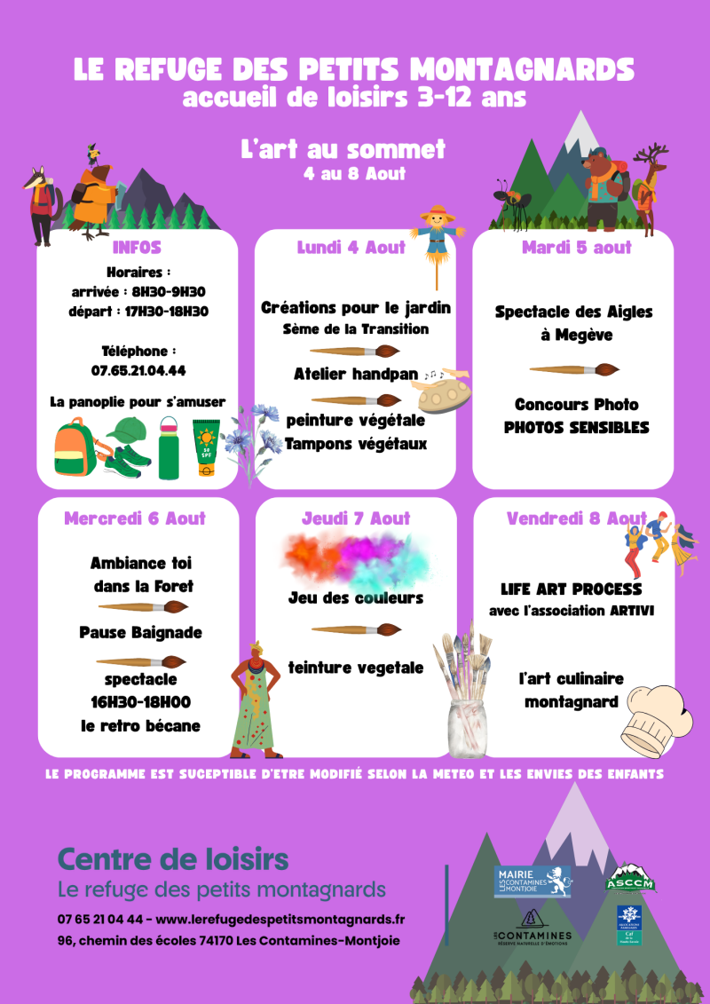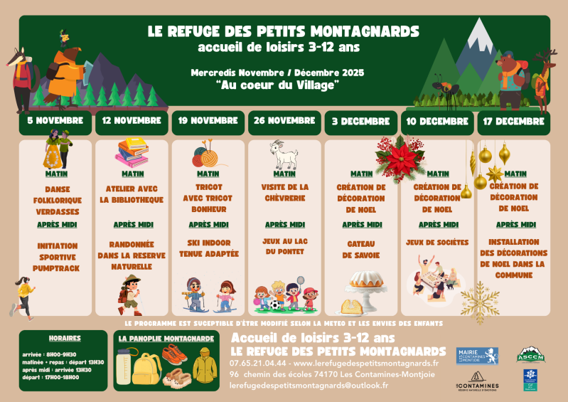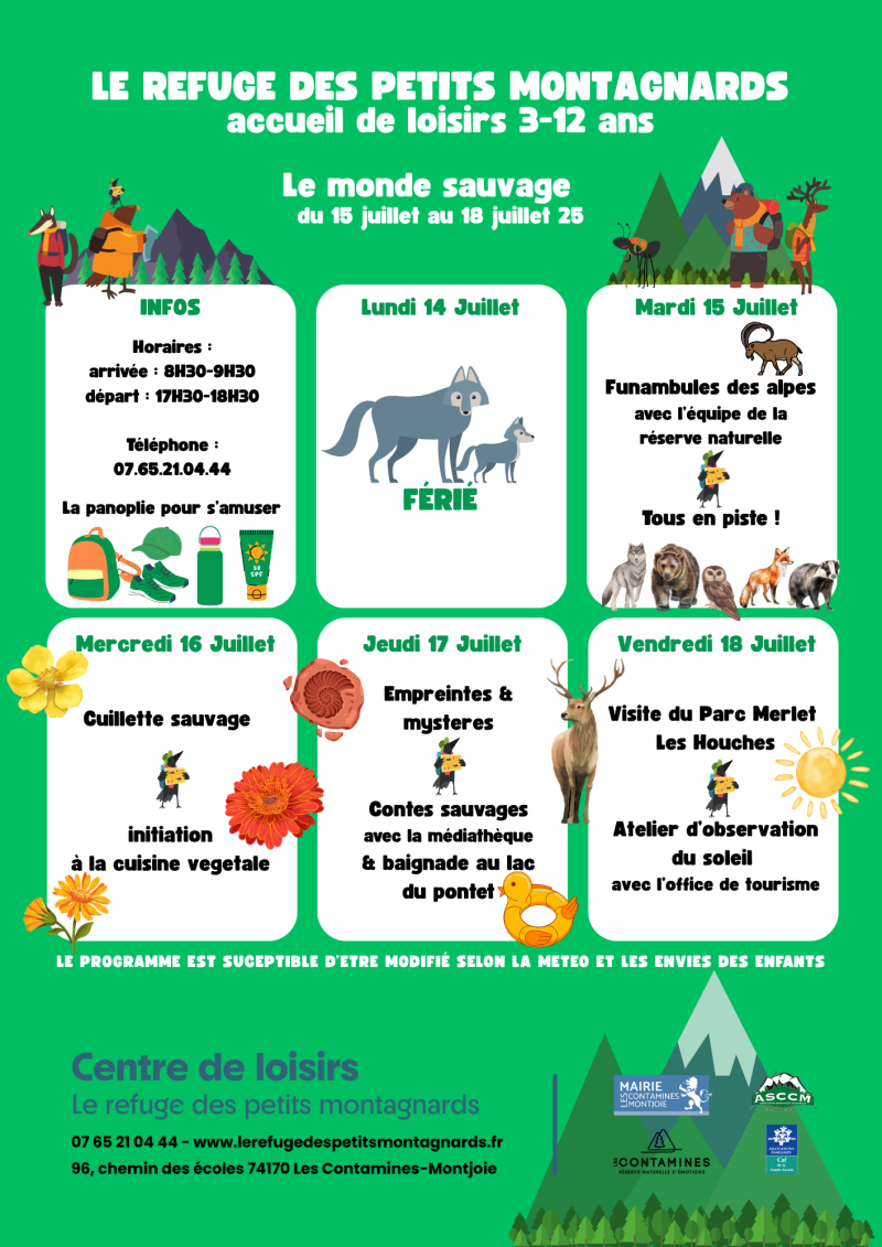 Les programmes sont affichés 2 semaines à l'avance. Il sont susceptibles d'être modifié selon la météo ou les envies des enfants.