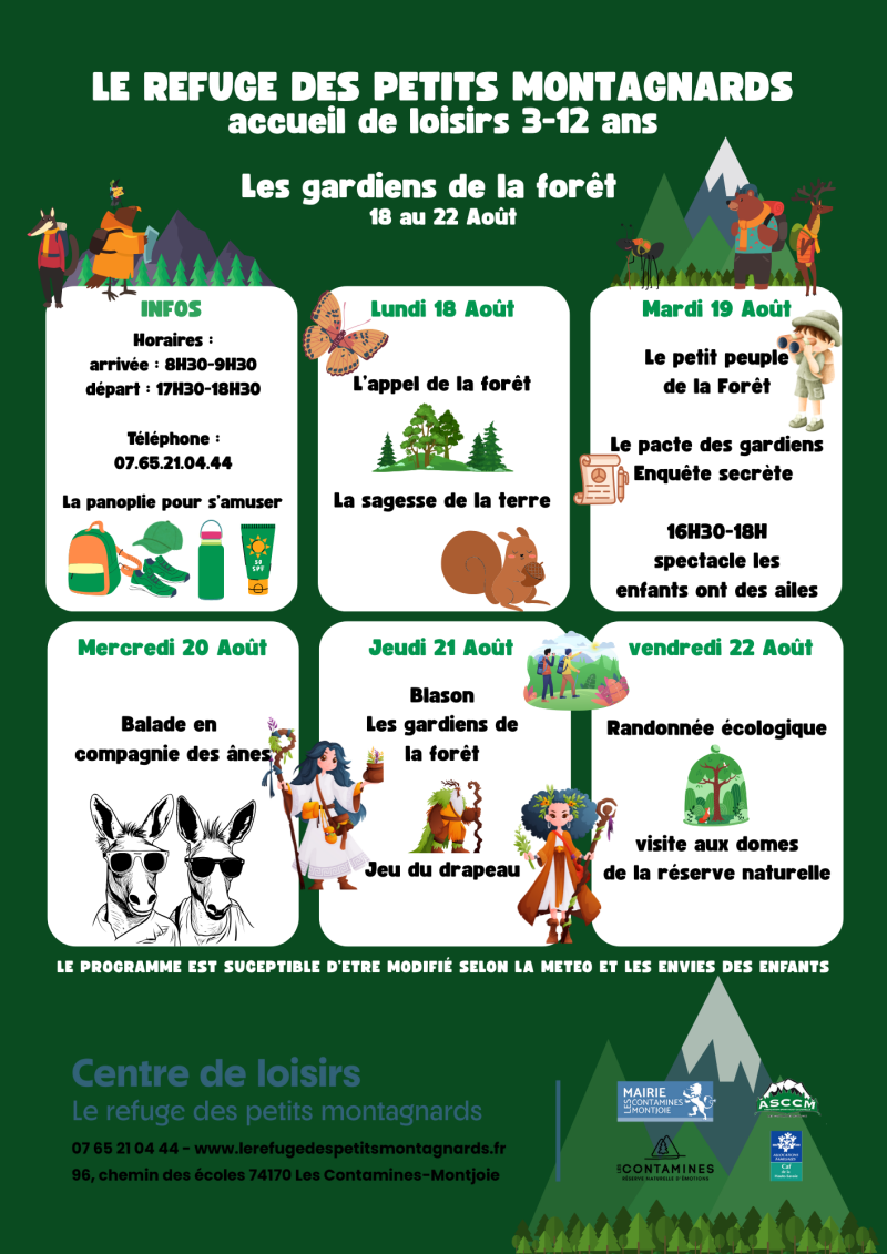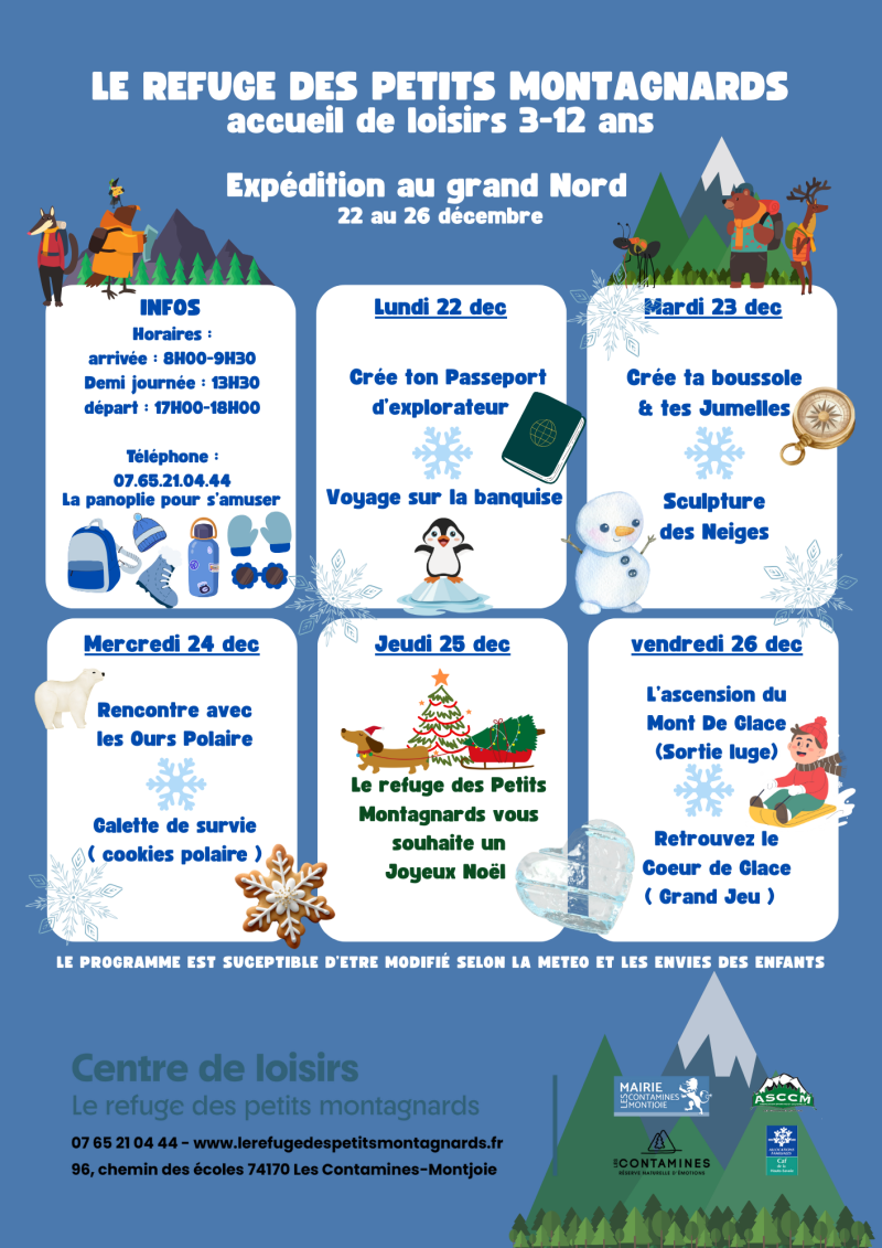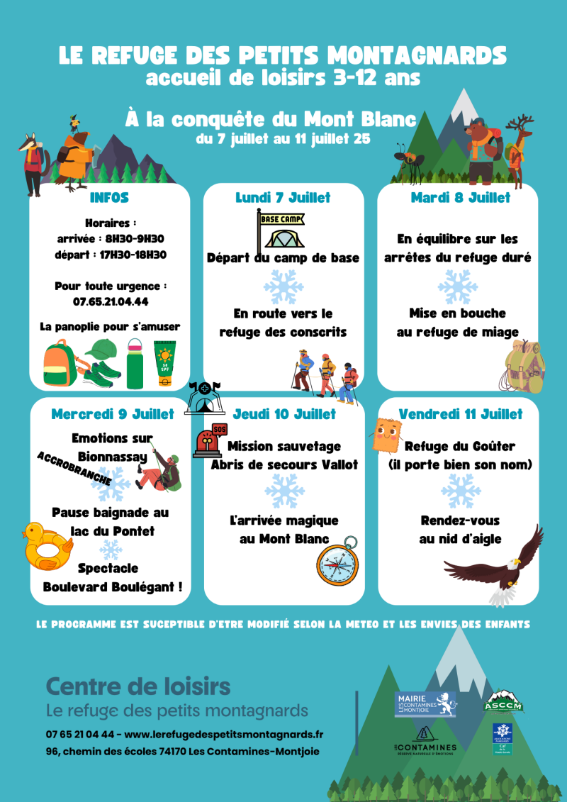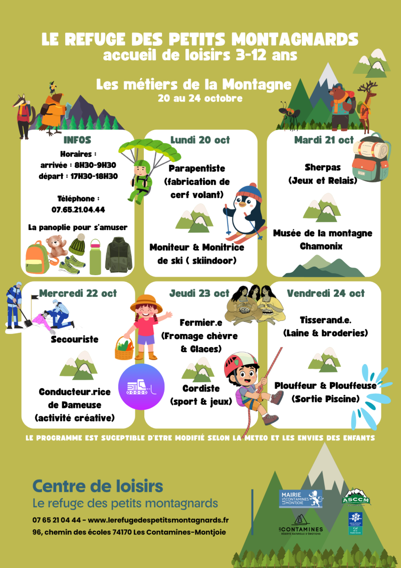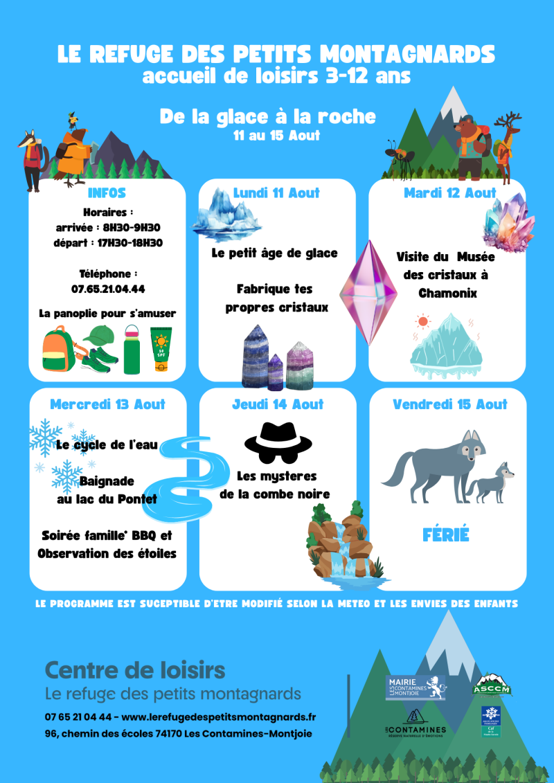 Les programmes sont affichés 2 semaines à l'avance. Il sont susceptibles d'être modifié selon la météo ou les envies des enfants.