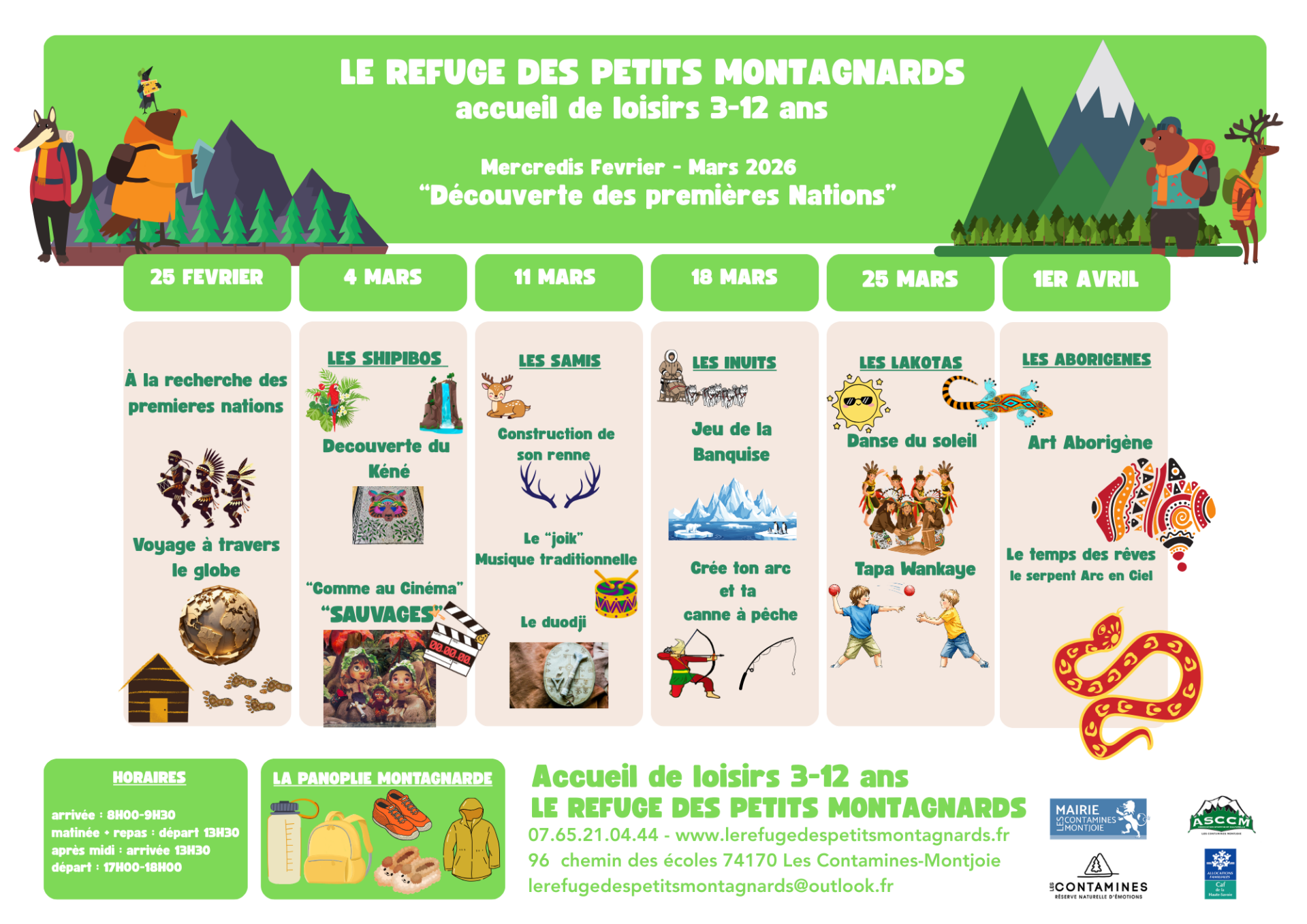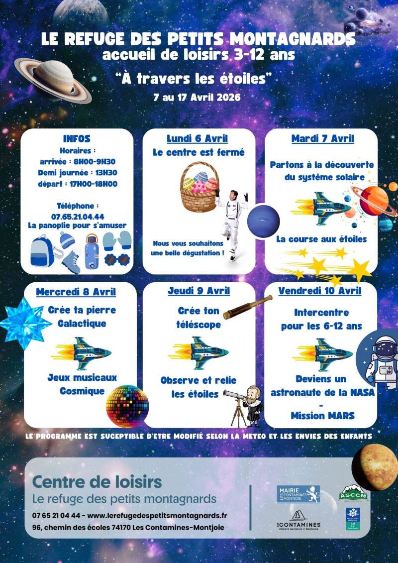 Les programmes sont affichés 2 semaines à l'avance. Il sont susceptibles d'être modifiés selon la météo ou les envies des enfants.